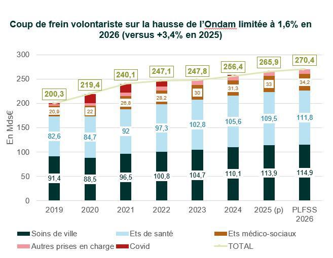 - Un objectif national des dépenses d’assurance maladie (ONDAM) particulièrement ambitieux, limité à 1,6% en 2026 (contre +3,4% en 2025), très en-deçà de l’évolution spontanée des dépenses de santé (+4,5%).