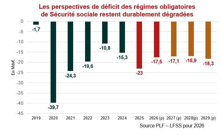 En vertu de ce texte, le déficit des régimes obligatoires de Sécurité sociale serait ramené de 23Mds€ en 2025 à 17,5Mds€ en 2026, ce qui représenterait un redressement des comptes de 5,5Mds€ en un an. Cette amélioration interviendrait de surcroît dans un contexte économique déprimé marqué par des perspectives de croissance limitées (à +1%) du PIB et de la masse salariale (+2,3%).