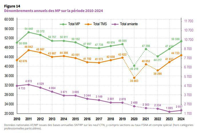 S’agissant des maladies professionnelles, le nombre de pathologies reconnues (50598) a, elle aussi, de nouveau augmenté de 6,7% en 2024, sous l’effet, comme les années précédentes, de la progression du nombre de troubles musculosquelettiques (TMS) reconnus (44723 en hausse de 6,6% en un an). Depuis le point bas atteint en 2022 (hors Covid), le nombre de MP a ainsi augmenté de plus de 14%, ce qui constitue le pire résultat depuis dix ans. Les TMS représentent invariablement près de 90% du total des maladies professionnelles reconnues, loin devant les MP liées à l’amiante (4%, mais en hausse de 8,5% par an) ou encore des cancers hors amiante (0,6% du total des MP, mais en hausse de 18,6% en un an). De leur côté, les troubles mentaux et du comportement, avec 1177 cas reconnus d’origine professionnelle, en hausse de 9% en un an, représentent près de 70% du total des dossiers acceptés hors tableaux (2599).