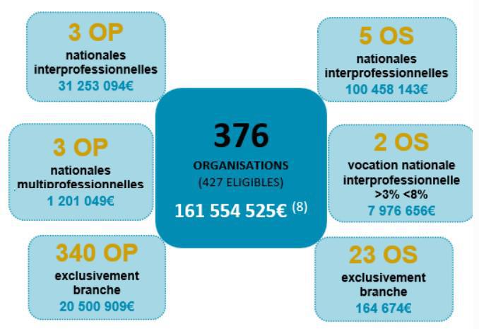 Ainsi, les 7 organisations syndicales nationales (CFDT, CFE-CGC, CFTC, CGT, FO, Unsa et Solidaires) ont perçu 108,4M€ (+12,2% en un an), tandis que 23 organisations syndicales représentatives exclusivement au niveau des branches se sont partagées 164674€ (+2%). De leur côté, les organisations patronales interprofessionnelles nationales (Medef, CGPME et U2P) se sont réparties 31,2M€ (+7,5%) sur la base de leur représentativité respective. Les 391 organisations professionnelles de branche ont, de leur côté, reçu près de 20,4M€.