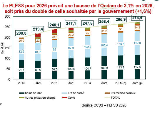 Alors que le gouvernement se faisait fort de contenir l’objectif des dépenses d’assurance maladie (Ondam) à 1,6% l’an prochain, la LFSS pour 2026 entérine finalement une hausse de 3,1% afin de le porter à 274,4Mds€ (article 109).