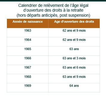 «Aucun relèvement de l’âge n’interviendra à partir de maintenant jusqu’en janvier 2028», a précisé Sébastien Lecornu, sachant qu’avec la réforme de 2023, l’âge légal d’ouverture des droits a déjà été porté à 62 ans et 6 mois pour la génération née en 1963 (lire KPS du 5 juin 2023). En conséquence, selon la lettre rectificative au PLFSS pour 2026 adressée, le 23 octobre 2025 au Parlement, le nouveau calendrier de relèvement de l’âge légal d’ouverture des droits à la retraite (hors départs anticipés) est le suivant :